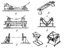 ПОВОРОТНЫЕ ПРИСПОСОБЛЕНИЯ (сборочно-сварочные) — приспособления для быстрого и удобного поворота изделия при сборке и сварке и помещения его в наиболее удобное для работы положение. К П. п. относятся роликовые опоры (приводные и ручные, стационарные и передвижные), различные типы кантователей (приводных и ручных, стационарных и передвижных), поворотные столы, манипуляторы, поворотные стенды и т. п. На рисунке приведены примеры поворотных приспособлений: а — приводная роликовая опора; б — ручная роликовая опора; в — кантователь; г — поворотный стенд; д — цепной кантователь; е — манипулятор.