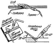 ПРАВАЯ СВАРКА — газовая сварка, при которой присадочный пруток движется позади пламени горелки. Наиболее удобно для сварщика в этом случае перемещать горелку слева направо. На рисунке показаны схемы правой сварки.