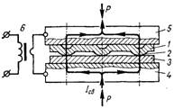 РЕЛЬЕФНАЯ СВАРКА, сварка выступами — особый вид точечной сварки, при котором расположение точек определяется заранее подготовленными выступами в деталях. На рисунке приведена схема рельефной сварки: соединяемые детали 2 и 3 (первая из них с выступами 2) сжимаются усилием Р между нижней (неподвижной) и верхней (подвижной) контактными плитами 4 и 5, соединенными шинами со вторичным витком сварочного трансформатора 6. Стрелками указан путь сварочного тока.