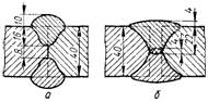 СВАРКА ПО ЗАДАННОМУ ЗАЗОРУ — двусторонняя автоматическая сварка под флюсом листов относительно большой толщины, при которой разделка кромок не производится, а вместо этого увеличивается зазор между свариваемыми кромками. Подварочный шов выполняется на флюсовой подушке. Закорачивание электрода на изделие для возбуждения дуги осуществляется на одной из кромок заходной планки. После зажигания дуги электрод выводится на центр зазора. Этот способ основан па известном положении о том, что при заданном режиме сварки общая высота сварного шва, слагающаяся из глубины проплавления и высоты усиления шва, не зависит от формы и глубины разделки. На рисунке показаны швы двусторонней автоматической сварки под флюсом, выполняемые без зазора (а) и по зазору (б).
