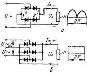 СВАРОЧНЫЙ ВЫПРЯМИТЕЛЬ (для дуговой сварки) — источник постоянного сварочного тока, состоящий из сварочного трансформатора с регулирующим устройством и блока полупроводниковых вентилей. Иногда в комплект С. в. входит еще дроссель, включаемый в цепь постоянного тока. В С. в. используются преимущественно селеновые или кремниевые вентили. Существуют две типовые схемы выпрямления: однофазная мостовая схема двухполупериодного выпрямления и трехфазная мостовая схема. Последняя имеет значительные преимущества перед однофазной, заключающиеся в меньшей пульсации напряжения, лучшем использовании трансформатора и более равномерной загрузке трехфазной сети. Поэтому трансформаторы для С. в. выполняются в подавляющем большинстве случаев трехфазными. Различают С. в. с пологопадающими и с падающими внешними характеристиками. На рисунке показаны однофазная (а) и трехфазная (б) мостовые схемы двухполупериодного выпрямления.