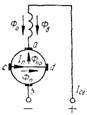 СВАРОЧНЫЙ ГЕНЕРАТОР ПОПЕРЕЧНОГО ПОЛЯ — генератор с падающей внешней характеристикой, получаемой путем применения продольного размагничивающего потока якоря, причем короткозамкнутая обмотка якоря используется для создания поперечного магнитного потока (основного). На рисунке показана принципиальная электрическая схема сварочного генератора поперечного поля: a, b — основные щетки, к которым подключаются сварочные провода; c, d — дополнительные, замкнутые накоротко щетки; Фп — поперечный магнитный поток; Фпр — продольный размагничивающий поток; Фо, Фв — соответственно поток остаточного магнетизма полюсов генератора и магнитный поток сериесной обмотки возбуждения; Iп — намагничивающий ток короткозамкнутой обмотки якоря, создающий поперечный магнитный поток; Iсв — сварочный ток.