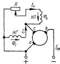СВАРОЧНЫЙ ГЕНЕРАТОР С РАСЩЕПЛЕННЫМИ ПОЛЮСАМИ — генератор с падающей внешней характеристикой, получаемой благодаря взаимодействию намагничивающих сил параллельных обмоток возбуждения, питаемых от одной основной и одной дополнительной щеток, и якоря, причем намагничивающая сила якоря действует аналогично последовательным размагничивающим обмоткам. Генератор имеет четыре полюса, являющиеся по существу двумя расщепленными, так как одноименные полюсы располагаются рядом. Такая конструкция имеет целью усилить размагничивающее действие реакции якоря и увеличить насыщение той части полюса, потоп которой желательно поддерживать при нагрузке неизменным (как известно, поперечный поток реакции якоря подмагничивает одну половину полюса и размагничивает другую). Генератор с расщепленными полюсами можно рассматривать как разновидность сварочного генератора с намагничивающей параллельной и размагничивающей последовательной обмотками возбуждения. На рисунке показана принципиальная электрическая схема сварочного генератора с расщепленными полюсами: a, b — главные щетки; c — дополнительная щетка; R — реостат; НГ, НП — намагничивающие обмотки главных и поперечных полюсов; Iг, Iп — токи в этих обмотках; Фг, Фп — их магнитные потоки; Iсв — сварочный ток.