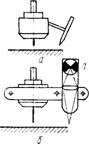УКАЗАТЕЛЬ С КОРРЕКТОРОМ (в сварочных аппаратах) — устройство для ручной корректировки конца электродной проволоки относительно шва при автоматической и полуавтоматической сварке под флюсом. Различают стрелочные и световые указатели. Первые представляют собой заостренный стержень, закрепляемый на сварочной головке или на флюсоподводе впереди электрода. Вторые состоят из низковольтной лампы накаливания и линзы, заключенных в трубку, которая закрепляется перед мундштуком 1. Световой указатель обычно образует впереди электрода светящуюся точку. Если указатель сходит с линии сварки, его возвращают в нужное положение с помощью корректора, позволяющего поворачивать вокруг шарнира сварочную головку или только ее мундштук. На рисунке схематически показаны стрелочный (а) и световой (б) указатели; Л — лампа накаливания.