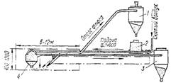 ФЛЮСОАППАРАТ НАГНЕТАТЕЛЬНОЙ СИСТЕМЫ, нагнетательный флюсоаппарат — флюсоаппарат, действие которого основано на подаче флюса в зону сварки с помощью сжатого воздуха. Уборка нерасплавившегося флюса при этом производится дополнительным флюсоаппаратом всасывающей системы. Ф. н. с. используются преимущественно в специализированных установках для автоматической сварки, например в установках для сварки продольных швов труб. На рисунке приведен Ф. н. с. установки для сварки под флюсом внутренних швов длинных труб. Флюс из бункера-питателя 2 струей сжатого воздуха переносится в бункер-дозатор 4, в котором благодаря изменению направления движения потока он выпадает на дно, а воздух с пылью направляется по трубопроводу к пылесборнику 3 и затем выходит наружу. На том же рисунке показан отсос флюса дополнительным флюсоаппаратом 1.