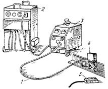 ШЛАНГОВЫЙ АВТОМАТ — сварочный аппарат, в котором головка разделена конструктивно на две части — механизм подачи и механизированный держатель, перемещаемый вдоль линии сварки от специального малогабаритного электродвигателя. Обе части соединены между собой шланговым проводом, по которому подается сварочная проволока, а также подводится сварочный ток и проходят провода цепи управления, подобно тому, как это происходит в сварочных полуавтоматах. На рисунке показан шланговый автомат: 1 — шланговый провод; 2 — шкаф управления; 3 — механизм подачи; 4 — механизированный держатель;5 — пульт управления.