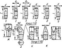 ЭЛЕКТРОДЫ — 1. Детали, включаемые в сварочную цепь для подвода тока к обрабатываемому изделию. Электрод для дуговой сварки в виде металлического или угольного стержня, проволоки, металлической пластины и т.п. обычно служит одним из электродов дуги (см. Электроды, 2), при сварке на постоянном токе — чаще всего катодом, в то время как другим Э. является само изделие. Этот Э. может либо расплавляться в процессе сварки и непрерывно перемещаться в зону горения дуги, либо расходоваться сравнительно медленно, т. е. практически сохранять свои первоначальные размеры. Такие же Э. (расходуемые) используются и при электрошлаковой сварке. Специальные виды Э. находят применение при огневой резке. Электроды точечных машин являются парными частями самих машин и служат обычно не только для подвода тока к деталям, но и для передачи усилия. Наиболее часто встречающиеся конструкции этих Э. имеют цилиндрический корпус, с одной стороны оканчивающийся рабочей частью, а с другой закрепляемый в электрододержателе 2 (хвостовик электрода). Такие цилиндрические Э. с прямолинейной осью называются вертикальными. Существуют также Э. с криволинейной осью, называемые изогнутыми или фасонными. Важнейшими характеристиками Э., используемых в точечных машинах, являются форма их торцовой поверхности, контактирующей со свариваемым изделием, а также расположение этой поверхности относительно оси Э. Контактная поверхность обычно бывает плоской или сферической. Чаще всего используются Э. с плоской контактной поверхностью, центр которой находится на оси хвостовика (центрированные электроды) или же смещен относительно оси. Контактная поверхность может быть перпендикулярной оси хвостовика или же наклонной по отношению к ней. Иногда используются электроды со сменным рабочим концом в виде вставки (см. Электродная вставка). В процессе эксплуатации таких электродов производится замена одних лишь вставок. Электроды шовных машин имеют вид дисков или роликов, катящихся по линии сварки. В качестве электродов стыковых машин используются зажимные губки. На рисунке показаны основные виды электродов точечных машин: а, б — электроды со сферической контактной поверхностью; в, г, ж, и — электроды цилиндрической формы с усеченным конусом на их рабочей части; д, е, з, к — электроды специальной формы. 2. Проводники, посредством которых часть электрической цепи, образуемая проводами, соединяется с частью цепи, проходящей в неметаллической среде с ионной или электронной проводимостью. Э., находящийся при прохождении тока по данному участку цепи под более высоким потенциалом, называется анодом, а находящийся под более низким потенциалом — катодом. В сварочной дуге, а также в различных электрических приборах анодом называют Э., присоединенный к положительному полюсу источника питания, а катодом — Э., присоединенный к отрицательному полюсу. В гальванических элементах и аккумуляторах анодом и катодом называются соответственно положительный и отрицательный Э.
